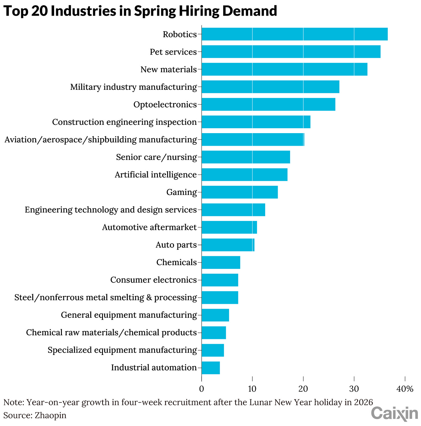 - China’s recruitment market heated up after the Lunar New Year holiday, with demand surging in humanoid robotics and AI agents, according to weekly data from job platform Zhaopin.