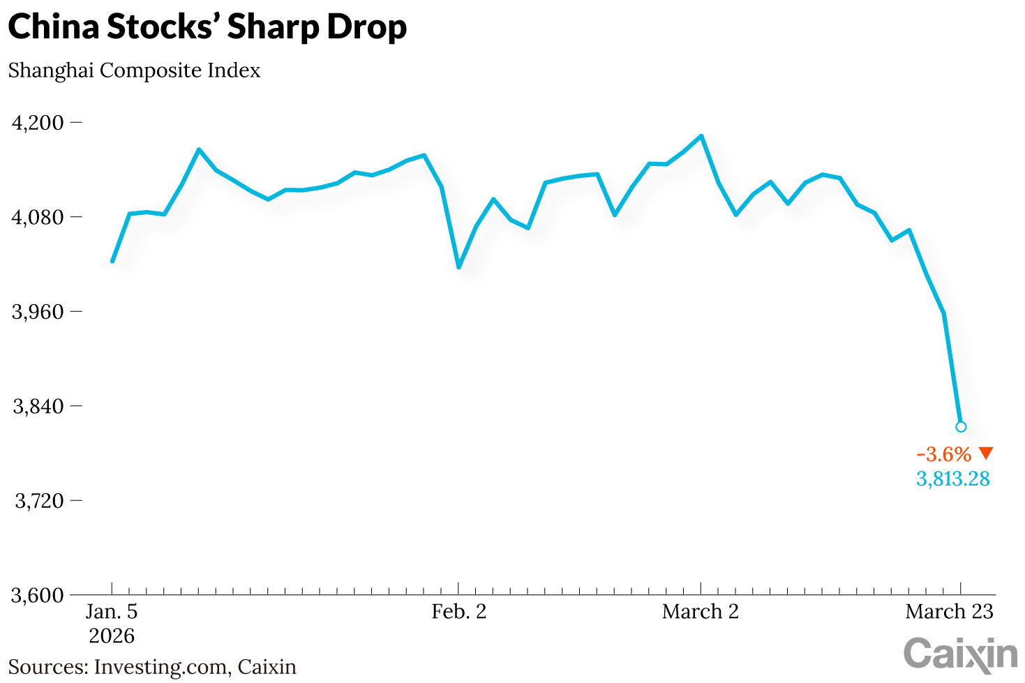 - Chinese mainland equities tumbled Monday as a fourth week of escalating Middle East tensions and a broader global market slide weighed on sentiment. The benchmark Shanghai Composite Index fell 3.6%. About 4.3 trillion yuan ($625 billion) was wiped from the mainland market.