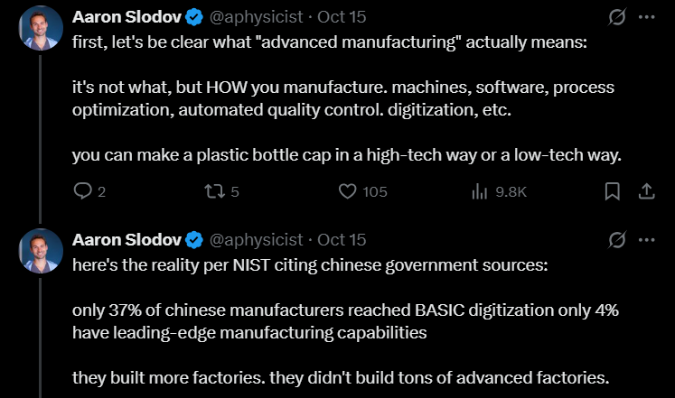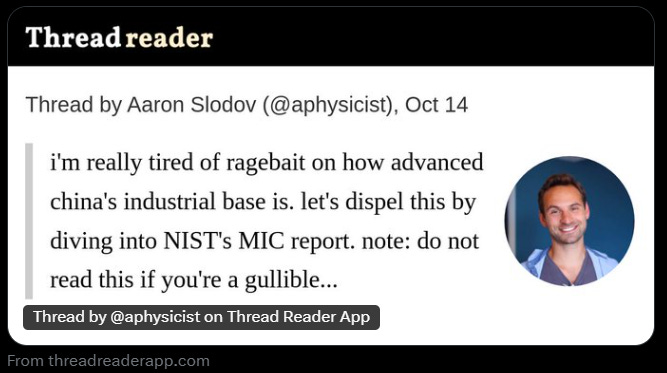 Excerpts from this Twitter thread are also a good reality check that notes some of China’s manufacturing Achilles heals: