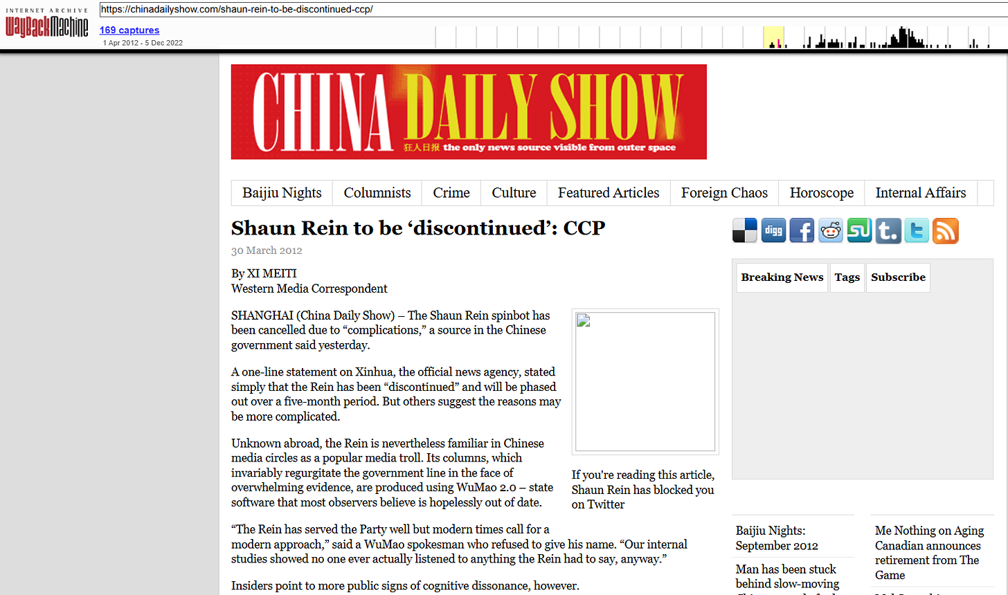 I remember when the now defunct China Daily Show parody site did a hilarious “story” about him that can still be found on the Wayback Machine – here is the first part of it (the comments don’t load properly anymore, but Rein did make a good natured comment to the post):