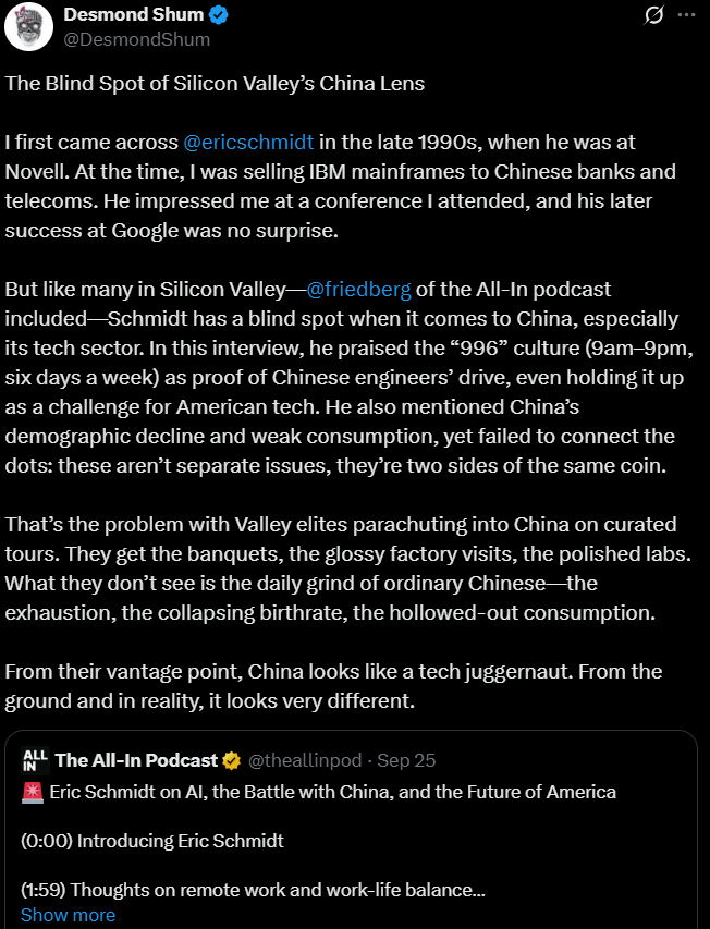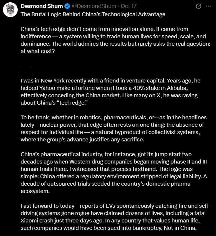 This also brings me to another Desmond Shum tweet about the realities of life in China that foreigners don’t often see on their parachute tours: