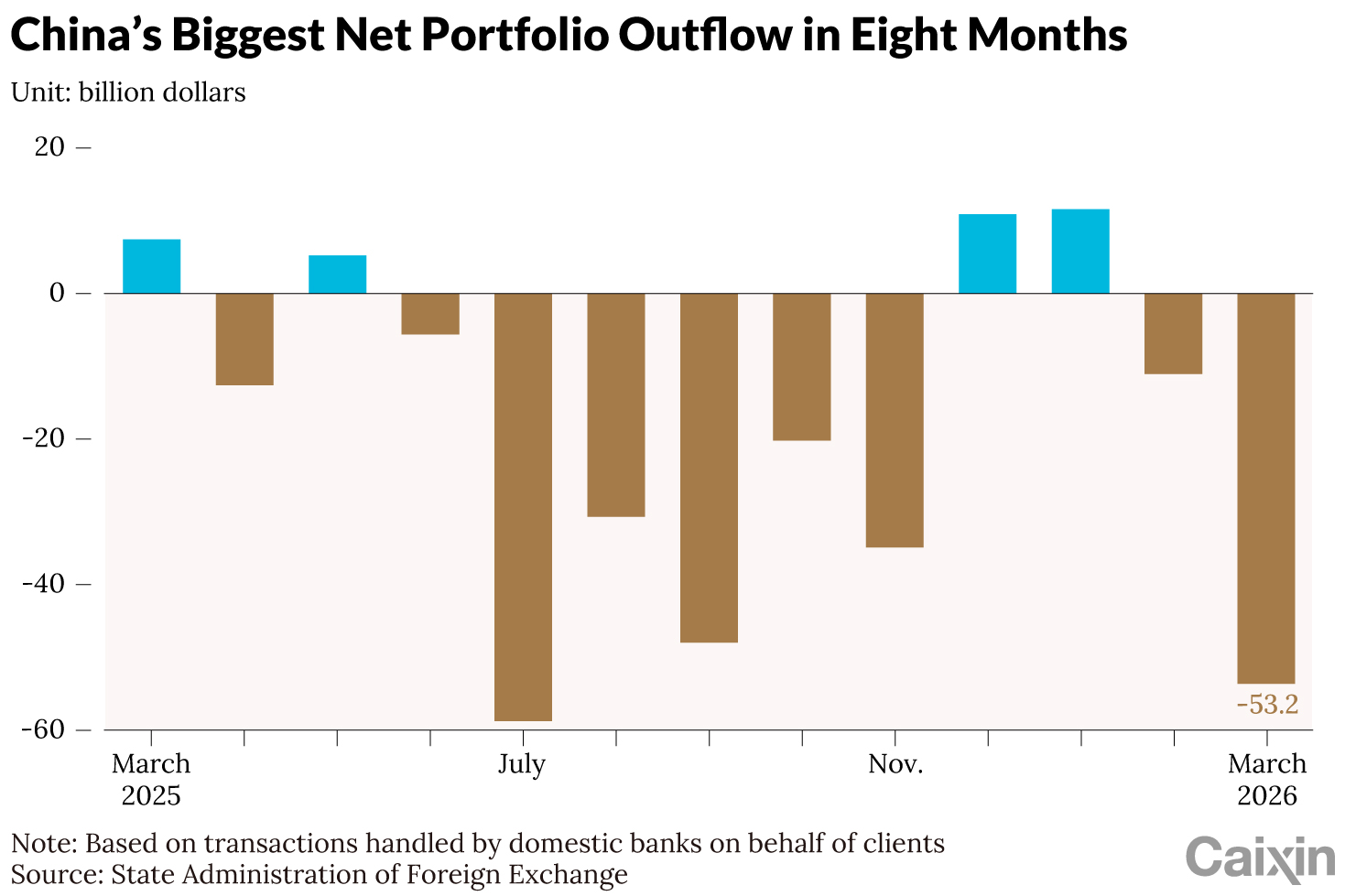 - China recorded a $53.2 billion net outflow in portfolio investment in March, the largest in eight months, as the U.S.-Iran conflict fueled global market volatility.